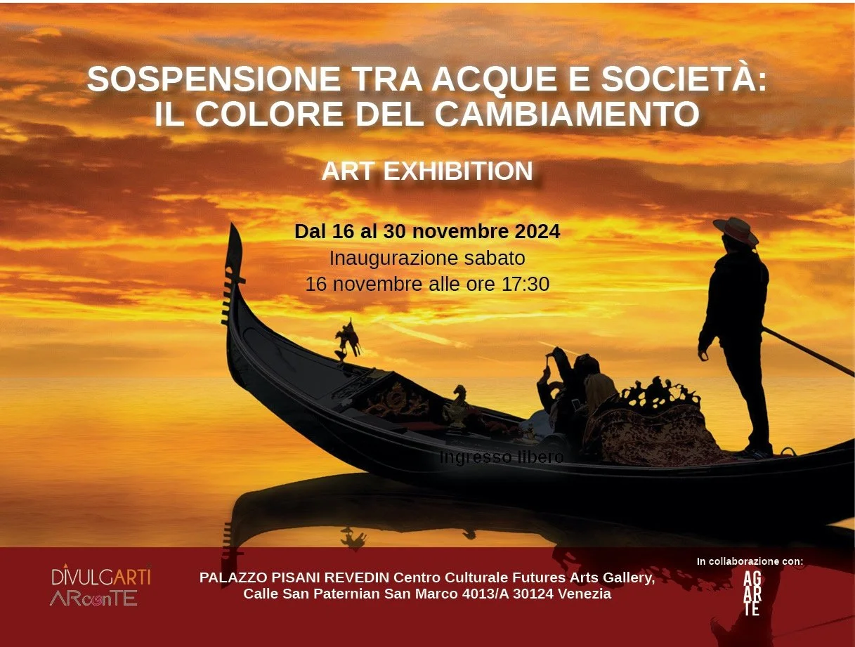 2024 ᛫ Mostra “Sospensione tra Acque e Società: il colore del cambiamento”. Un progetto di Divulgarti, con il supporto di ARconTE e Agarte - Fucina delle Arti - Galleria d’arte Contemporanea & Associazione Culturale, dal 16/11/2024 al 30/11/2024 al Palazzo Pisani Revedin - San Marco 4013/A 30124 Venezia (VE).